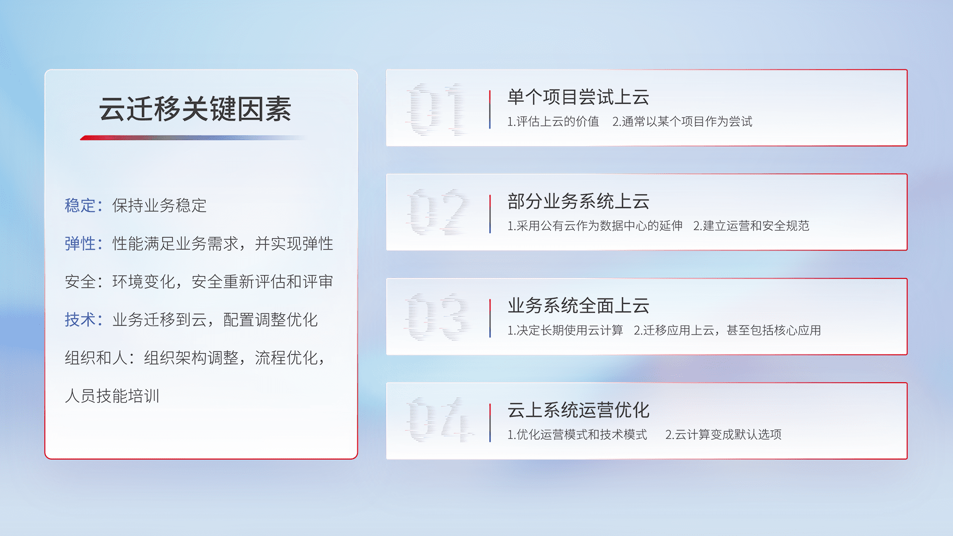 结合实际业务,,,从规划设计、、、云平台选型、、、、云原生改造、、数据迁移、、、集成交付,,,,迁移全过程为客户识别最佳上云路径,,,,做好风险识别管理,,,设计网络架构、、身份权限、、安全审计合规、、、操作审计、、日志审计、、监控告警策略、、、多站点容灾设计等,,,,对云上基础设施进行整体规划,,,提升IT治理水平,,,以满足弹性、、高可用、、、、高性能的需求。。。。
