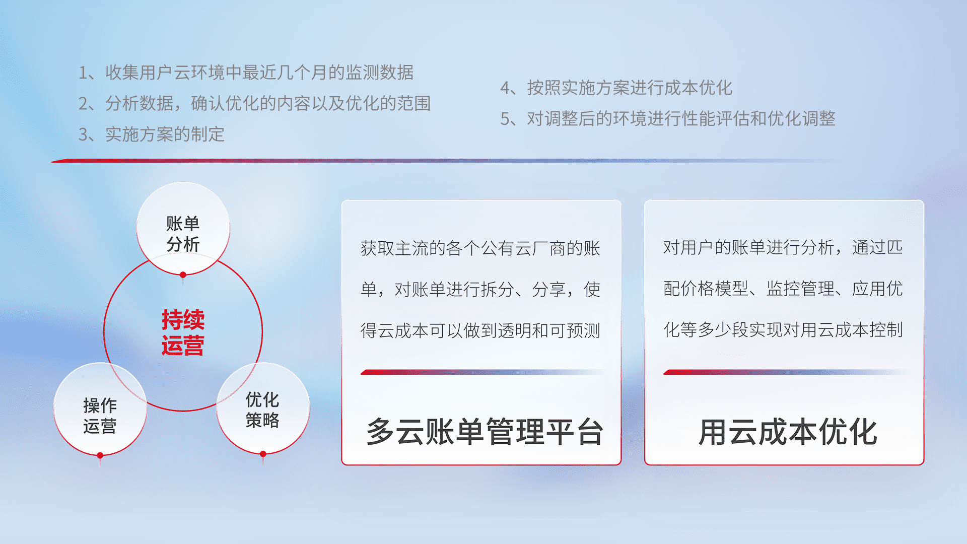 通过多云纳管,,以统一的资源数据模型把客户的云资源进行抽象和封装,,进而实现对多云资源的统一操作,,,保障云资源管理的可靠性、、稳定性与可用性。。。量身定制化运维内容,,,,配置、、开发运维、、、、补丁管理、、备份、、监控、、认证和访问管理、、、审计和日常巡检等,,保障在用云过程中的可靠度,,稳定度以及高可用率。。。